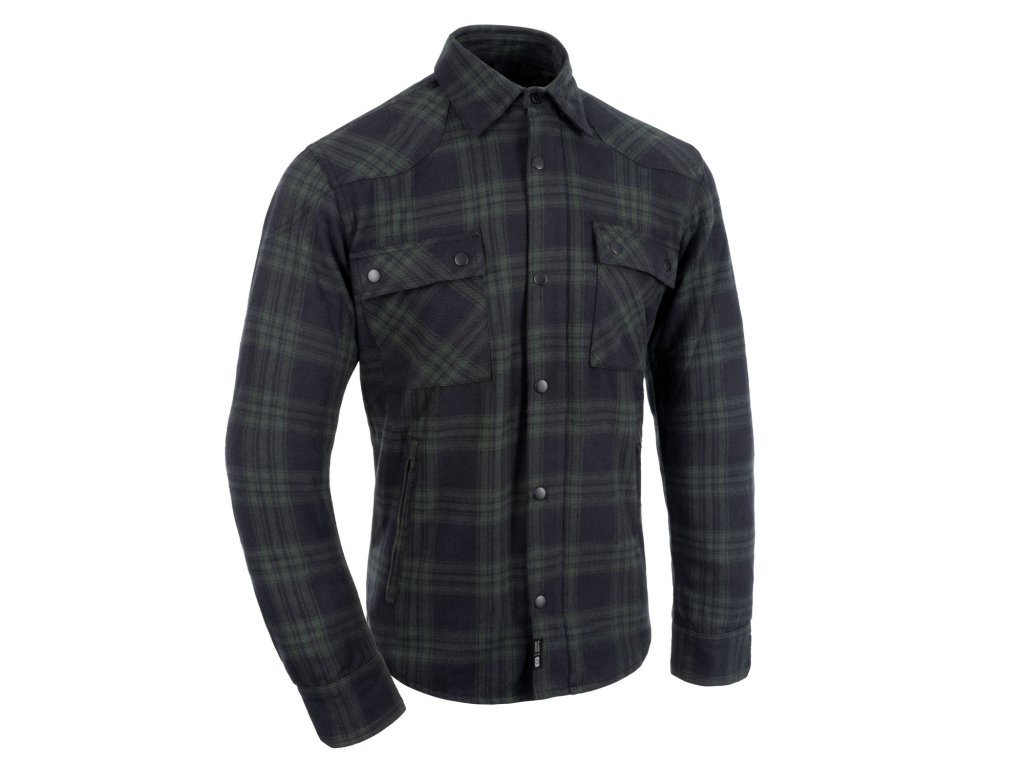 Štýlová moto-košeľa s technickým duchom – navrhnutá tak, aby vyzerala ako bežná košeľa, ale ponúkala zabezpečenie a pohodlie pri jazde.