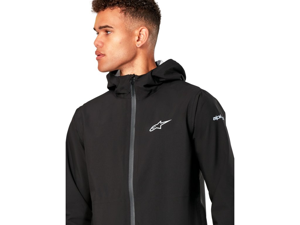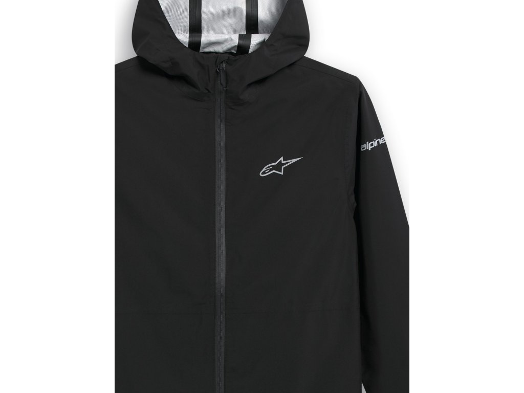 - Bunda s pevnou kapucňou, prehnutým strihom rukávov a centrálnym nepremokavým zipsom.