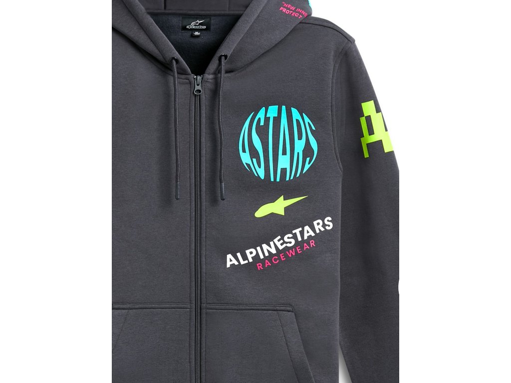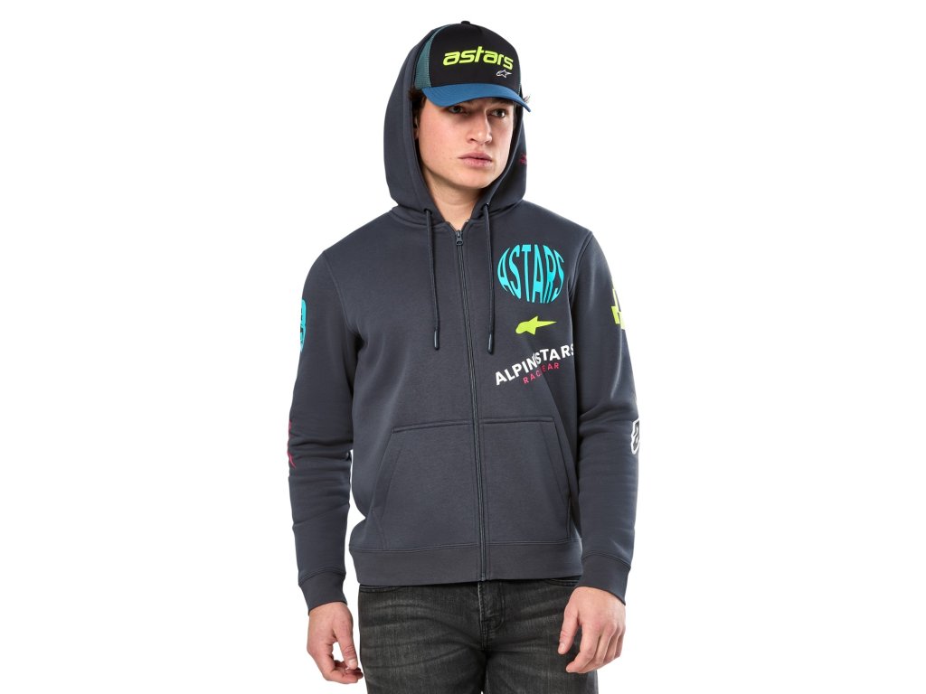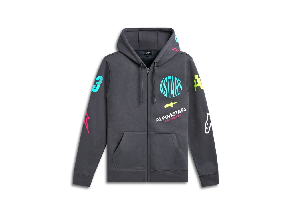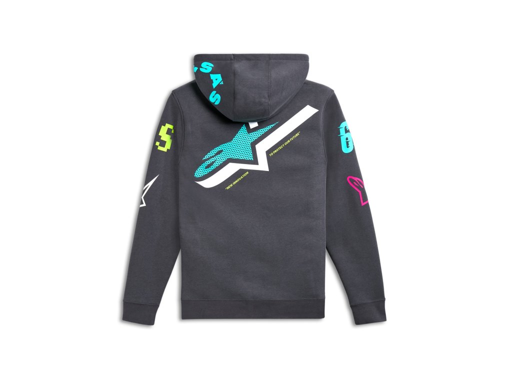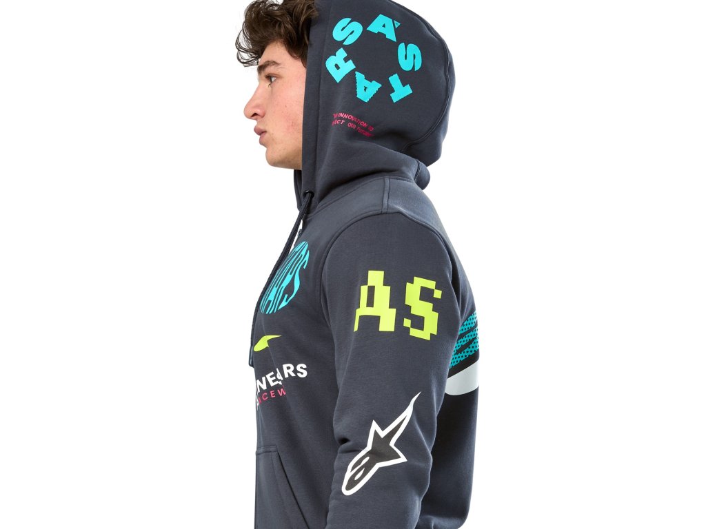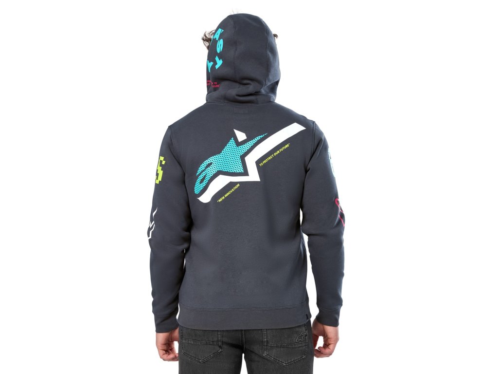 - Vonkajšie potlačené logá sa rozprestierajú po mikine.