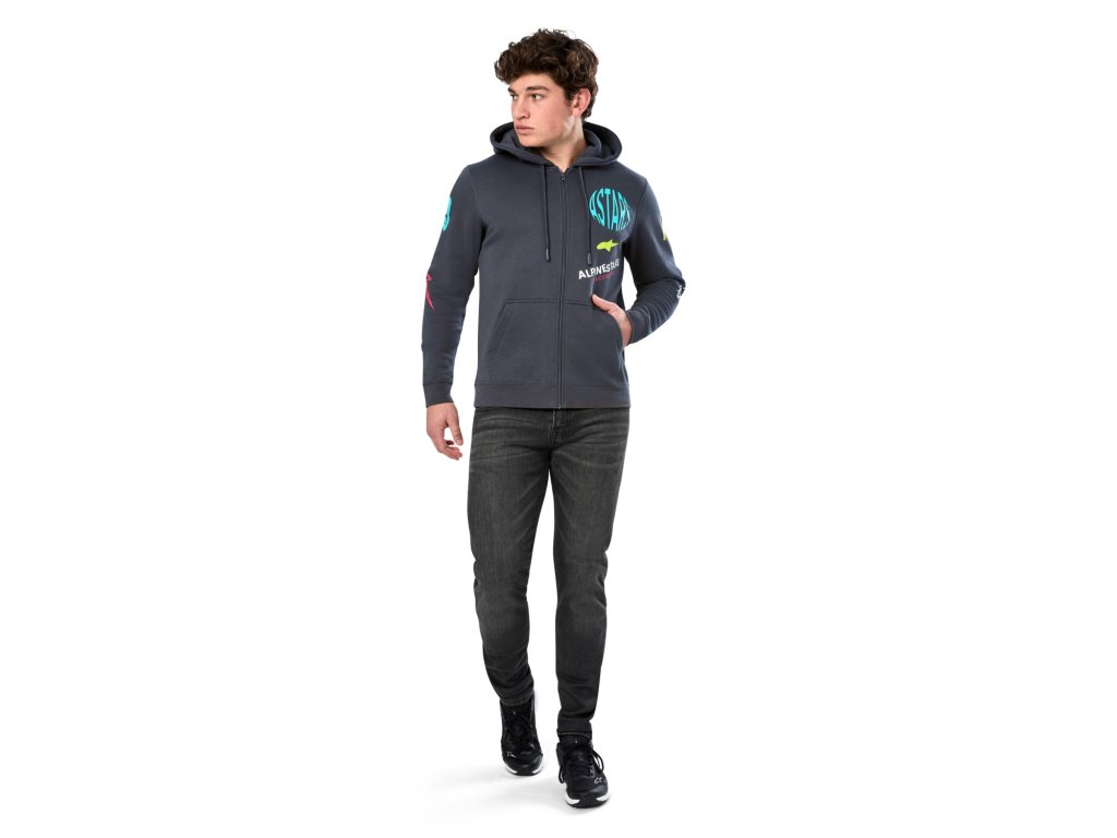 - Mikina s pozdĺžnym zipsom, kapucňou a dvoma vreckami na úrovni brucha.