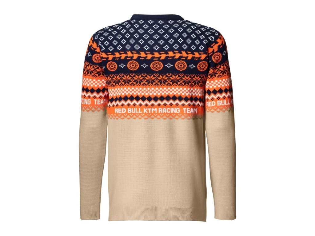 Farebný sveter KTM Red Bull Racing s vianočnými vzormi a logami Red Bull a KTM Red Bull Racing.