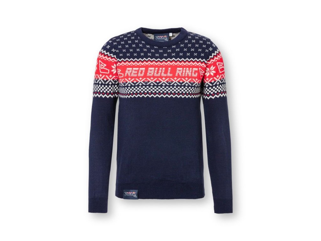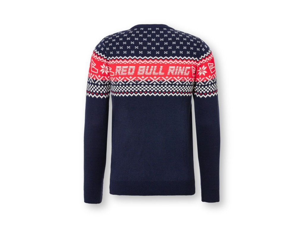 Tmavomodrý sveter Red Bull Ring s vianočnými vzormi a logami Red Bull a Red Bull Ring. Luxusný dizajn, pohodlný na nosenie.