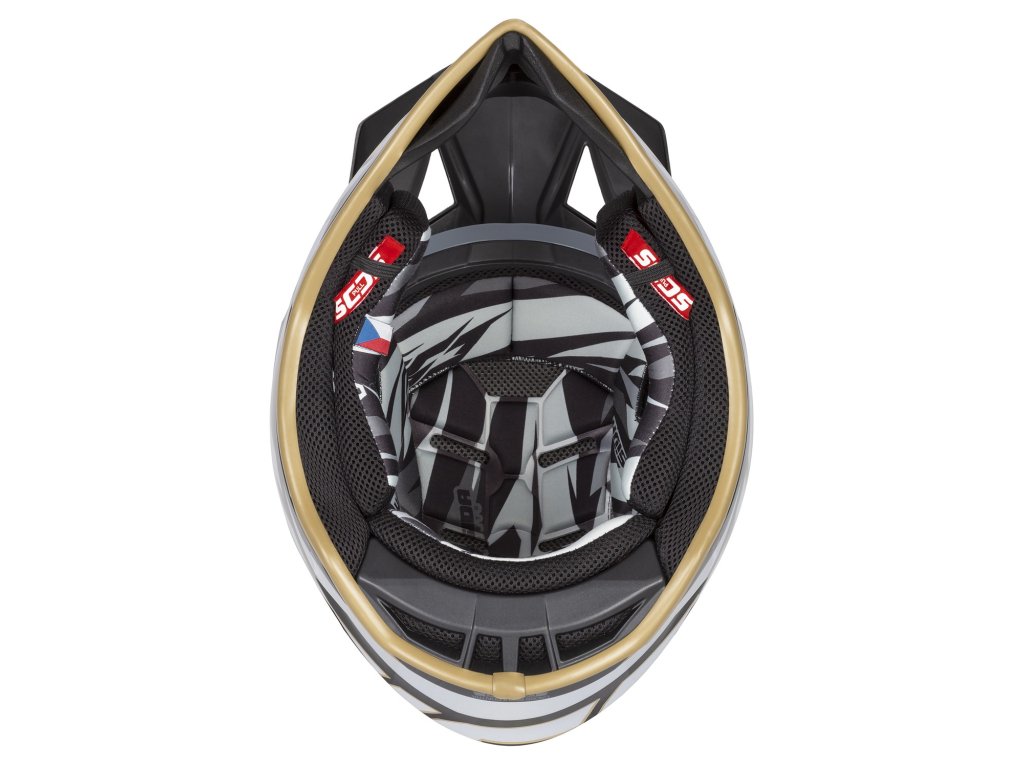 - Interiér s potlačou grafiky spojený s funkčným ventilačným systémom prilby.