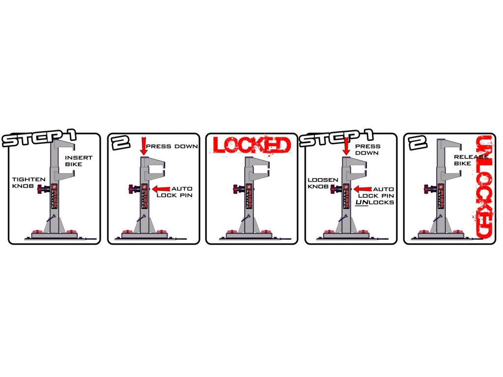 - 3. zatlačte horné čeľuste stojana nadol = motocykel je upevnený (pre väčšiu bezpečnosť môže byť motocykel upevnený pomocou upevňovacích hrotov)