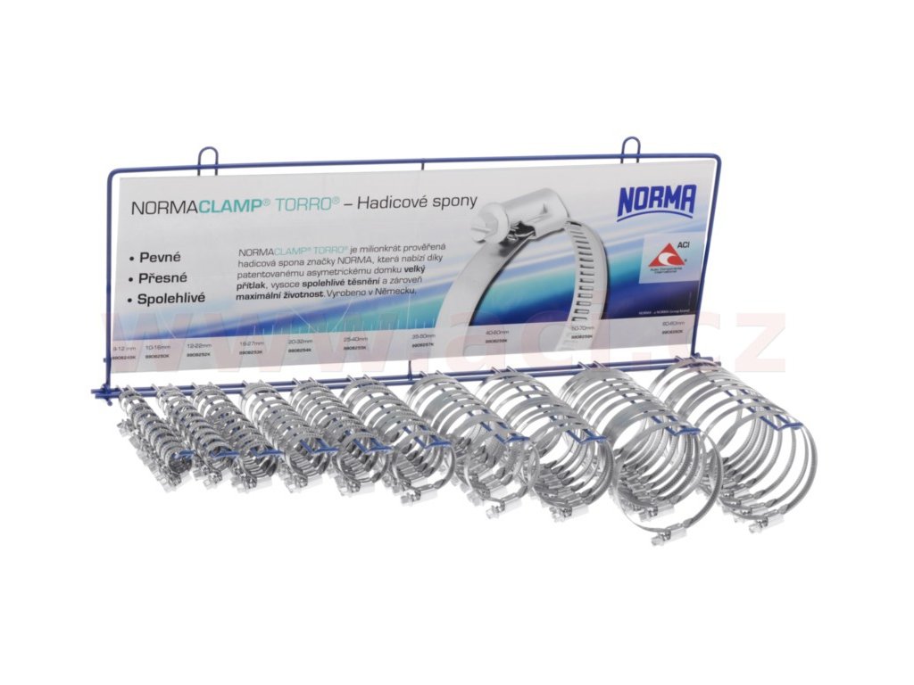 stojan vybavený neperforovanými hadicovými svorkami typ W1 10x10 ks NORMACLAMP TORRO - výroba Nemecko