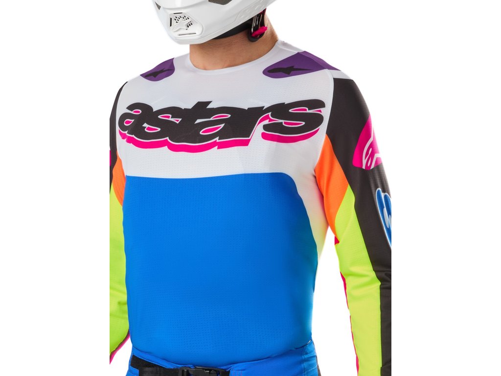 - Prepracovaná obšívka s atletickým racing strihom na telo obsahuje pokročilé strečové, ultraľahké materiály, ktoré tvoria tento dres najľahším mx dresom na trhu.