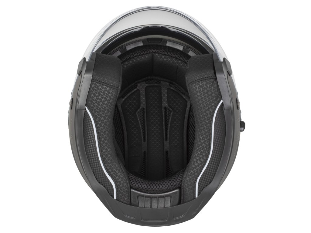 - Vnútorné plochy v oblasti pod podšívkou tváre obsahujú výrezy na vedenie káblov slúchadiel a komunikátora.