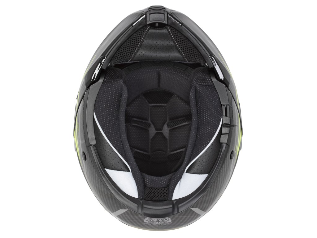 Ľahká karbónová škrupina, príprava na slúchadlá s káblami komunikátora a pohodlný interiér s čiastočným golierom na hlavu v spodných častiach, ktorý má veľké množstvo reflexných prvkov.
