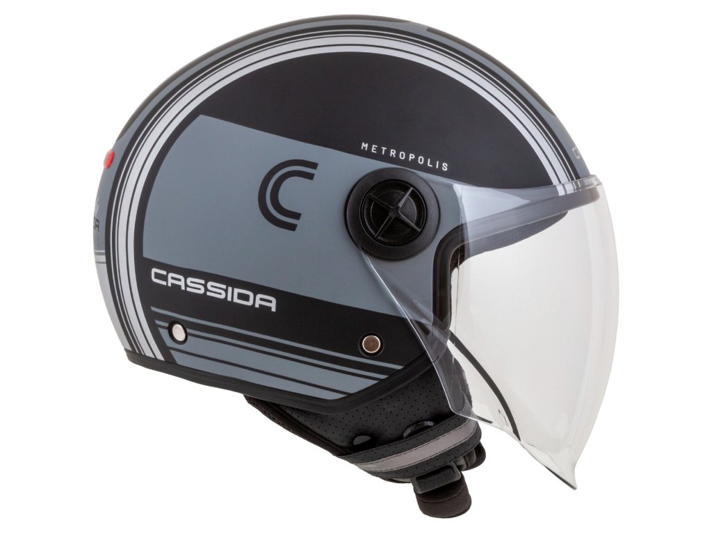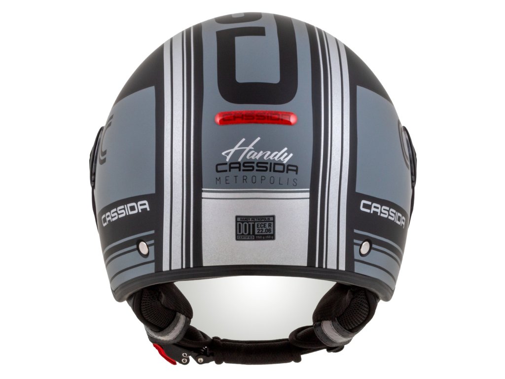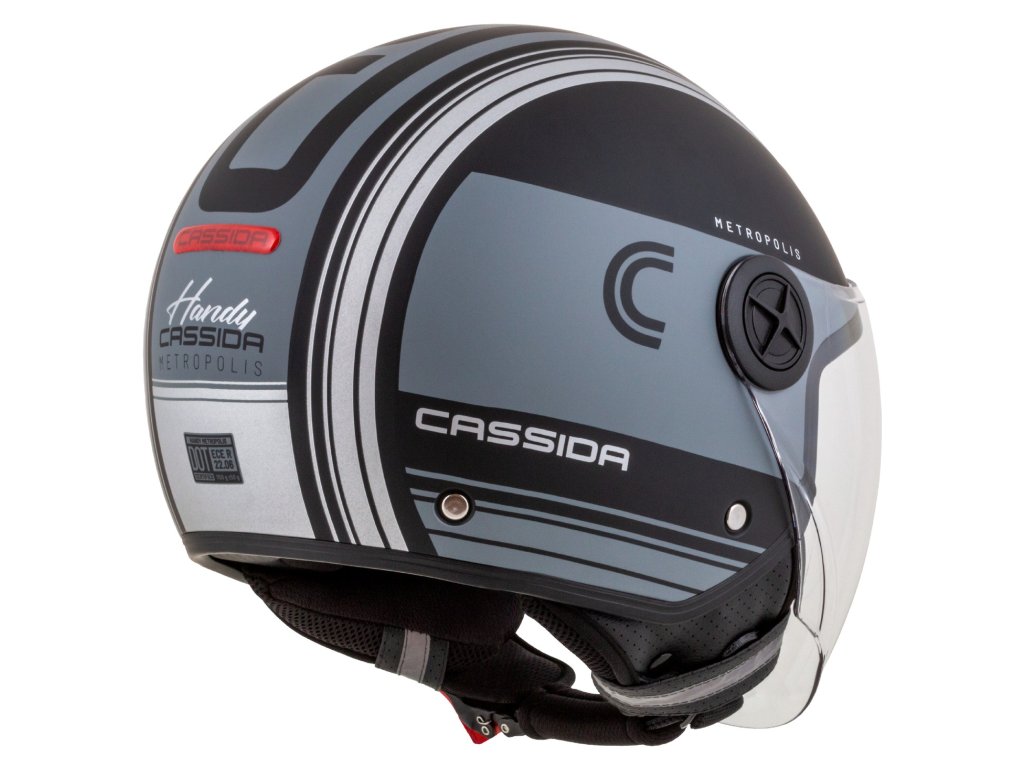 Prilba Handy je všestranná otvorená prilba, ktorá ponúka štyri prilby v jednej vďaka možnosti dlhého a krátkeho plexi, krátkeho priezoru a zátky plexi mechanizmu. Nízky profil škrupiny DEMI JET poskytuje pohodlné uloženie v kufri skútrov. EPS polystyrén v tvárovej časti s prípravou na komunikátorové slúchadlá. Prilba je certifikovaná podľa normy ECE 22.06. Praktická verzia Metropolis Vision s reflexnými grafickými prvkami a reflexnou nálepkou CASSIDA umiestnenou v zadnej časti prilby.