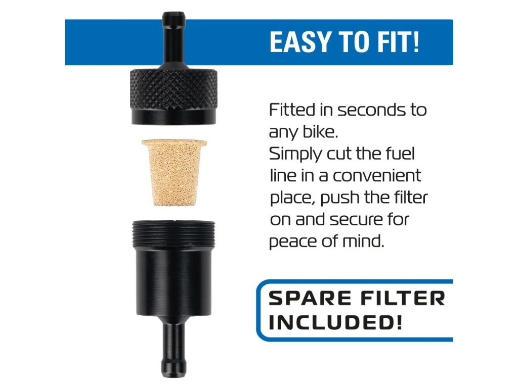 Tento filter možno namontovať na akýkoľvek motocykel v priebehu niekoľkých sekúnd. Stačí prerezať palivové potrubie na vhodnom mieste, namontovať filter a zabezpečiť ho na mieste, aby ste mali istotu.