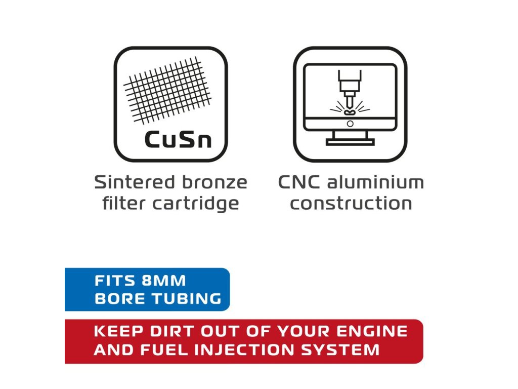 - Telo palivového filtra je vyrobené z hliníka CNC.