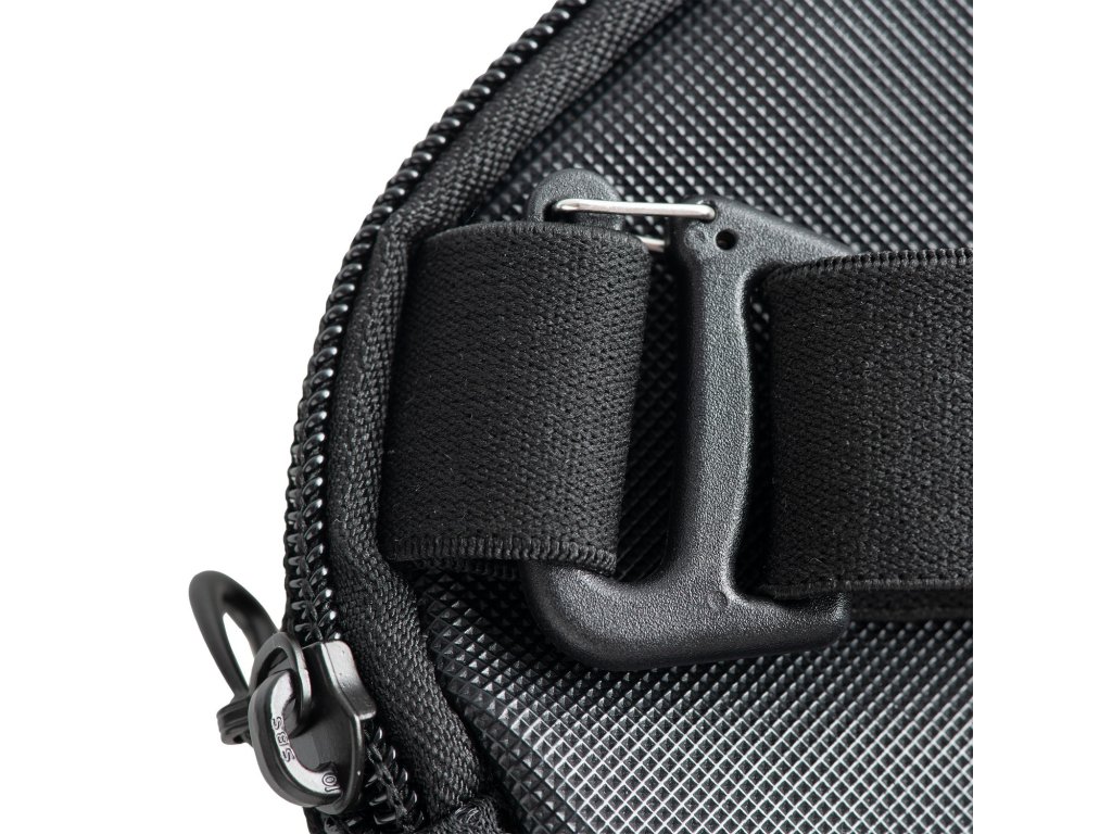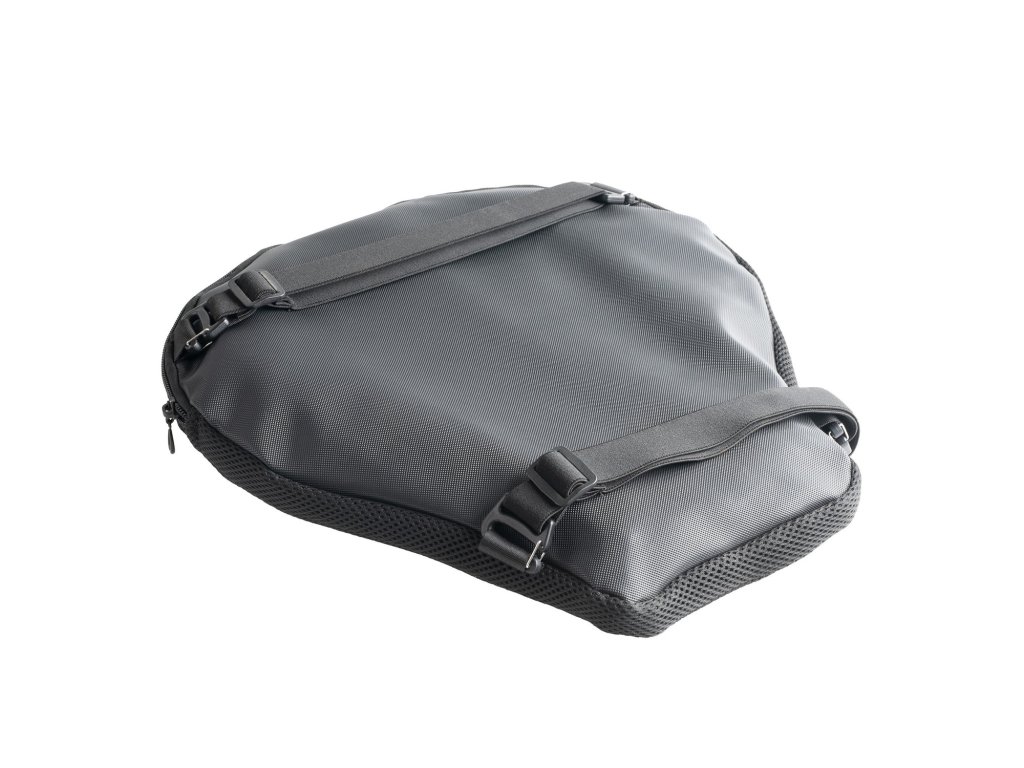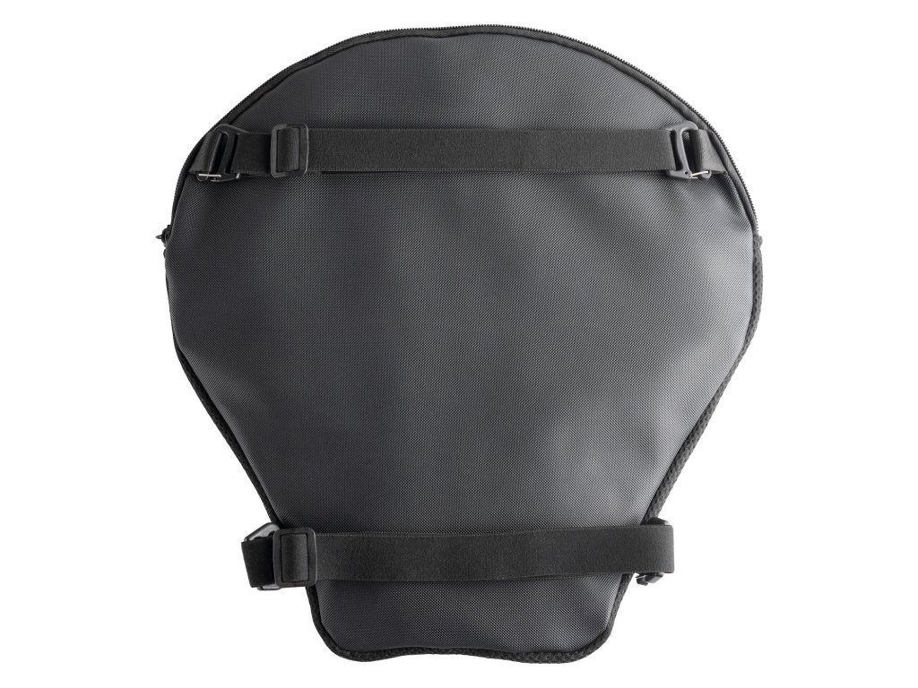 - 2 nastaviteľné textilné popruhy zaisťujú pevné uchytenie a tesnosť okolo sedadla motocykla.