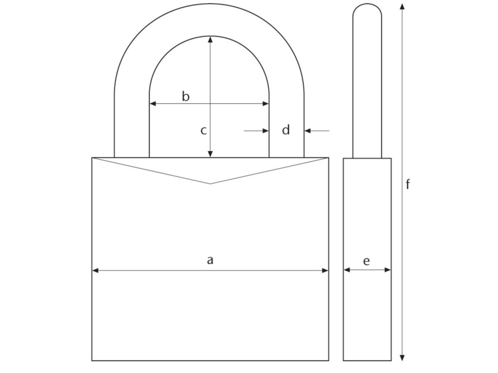 A) Šířka zámku; B) Světlá šířka oka; C) Světlá výška oka; D) Průměr oka; E) Hloubka zámku; F) Výška zámku;