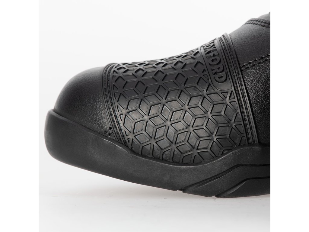 - Vnútorné plastové vložky z PU a polstrovanie na úrovni špičky, päty, členku a holene spevňujú konštrukciu topánky a slúžia ako skryté chrániče príslušných častí.