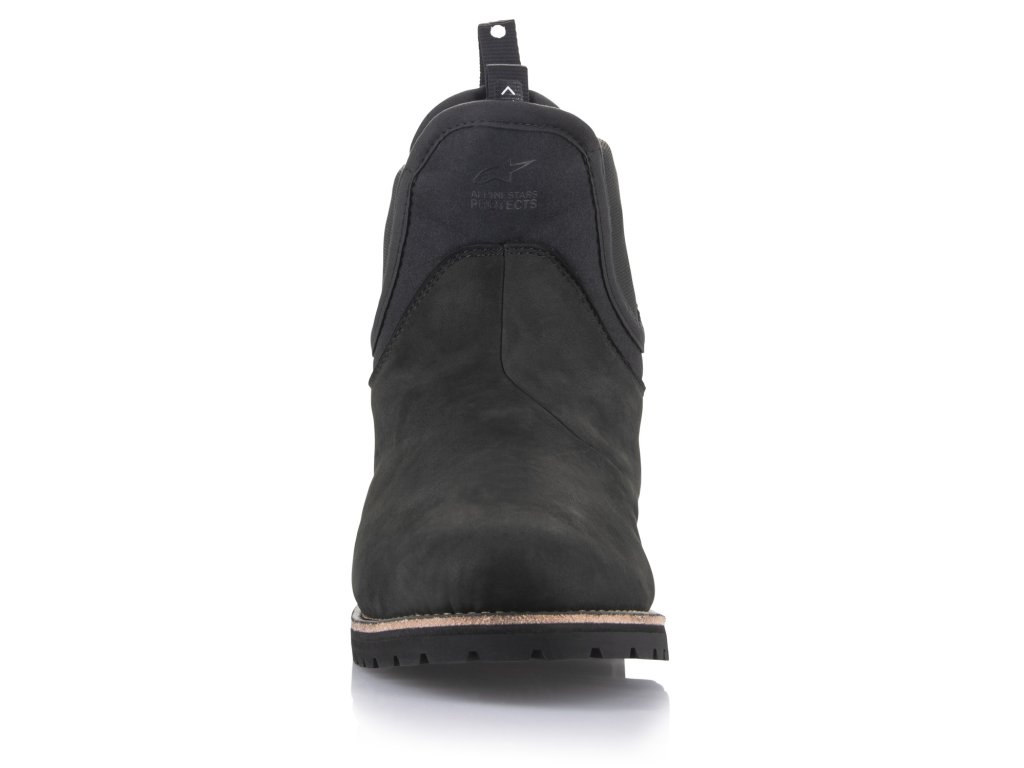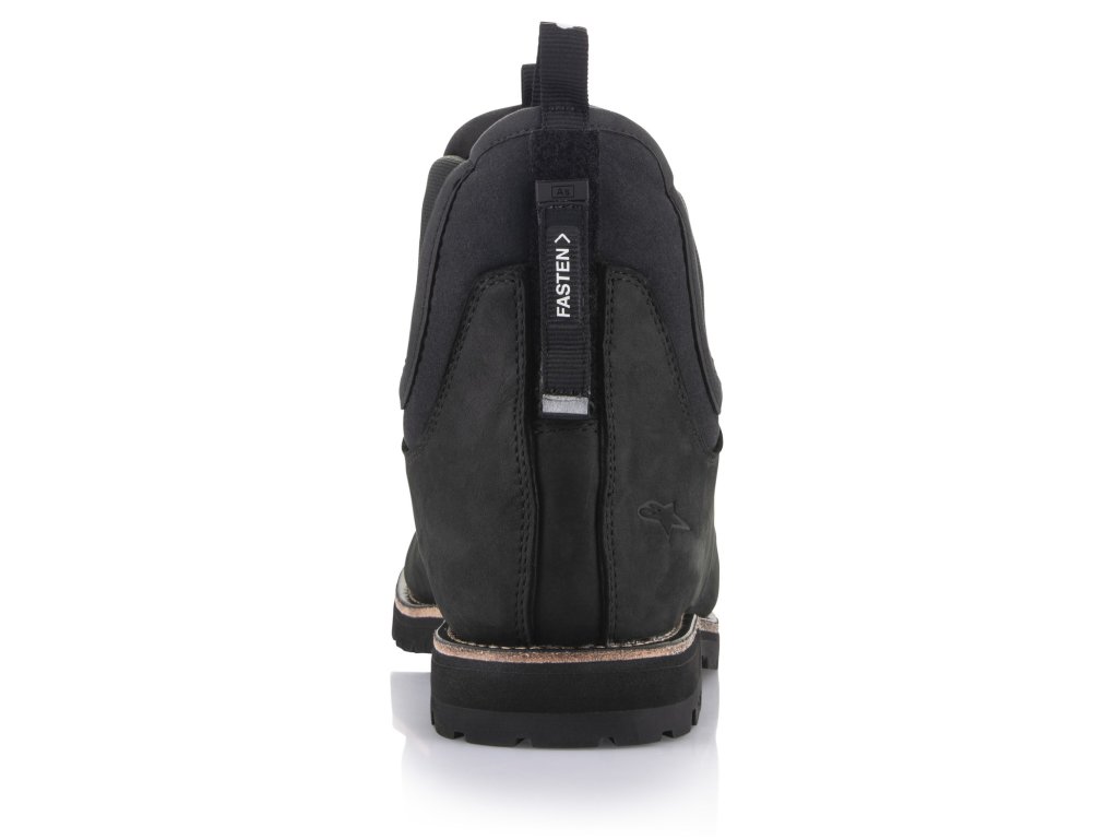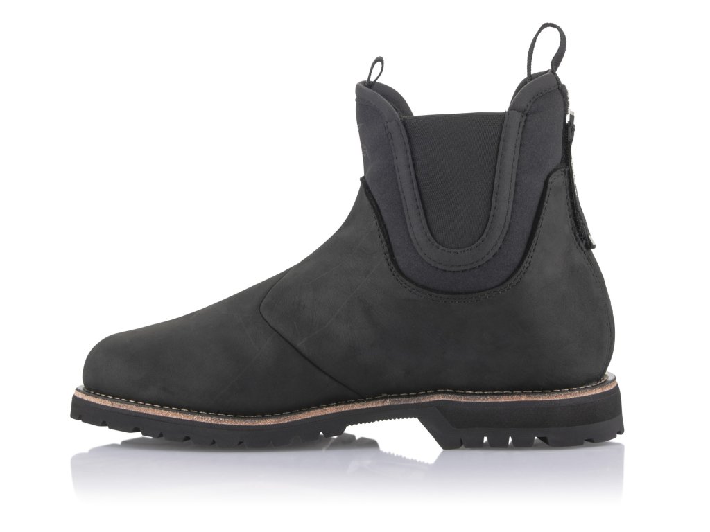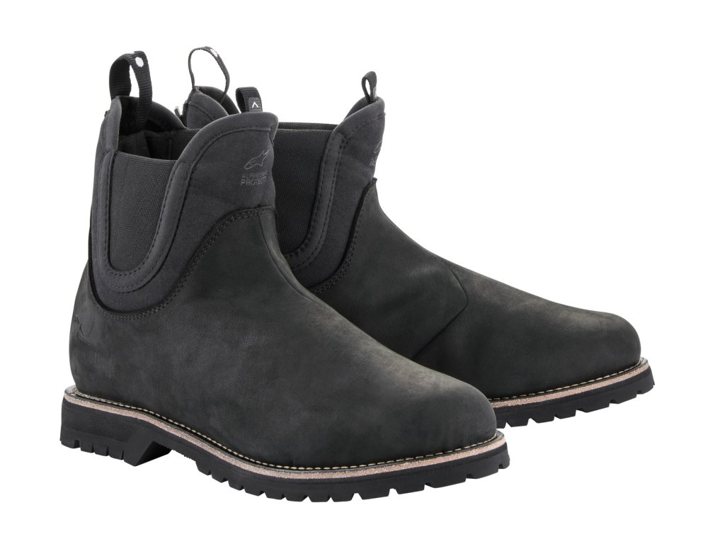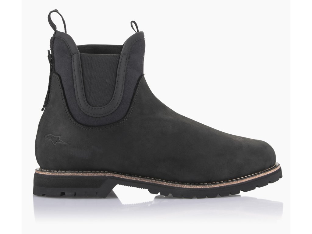 Klasická motorkárska obuv s 1,5 mm hrubou podšívkou z hovädzej kože vychádza z obľúbeného štýlu kožených členkových topánok Chelsea a vyznačuje sa vysokým komfortom vďaka strečovým panelom v oblasti členku. Aby topánka spĺňala všetky aspekty ochrannej motocyklovej obuvi vzhľadom na jej konštrukciu s vrchnou elastickou manžetou, spoločnosť ALPINESTARS vyvinula inovatívny systém uzamykateľného lanka, ktoré vedie pozdĺž okraja elastickej manžety. Po nasadení topánky ju jednoducho zaistíte zatiahnutím za predné a zadné pútko. Tým sa zabezpečí, že topánka je pružná a zároveň pevne drží na nohe. Vhodné na pohodlné nosenie topánky diskrétne pod nohavicami. Topánky majú certifikát CE.