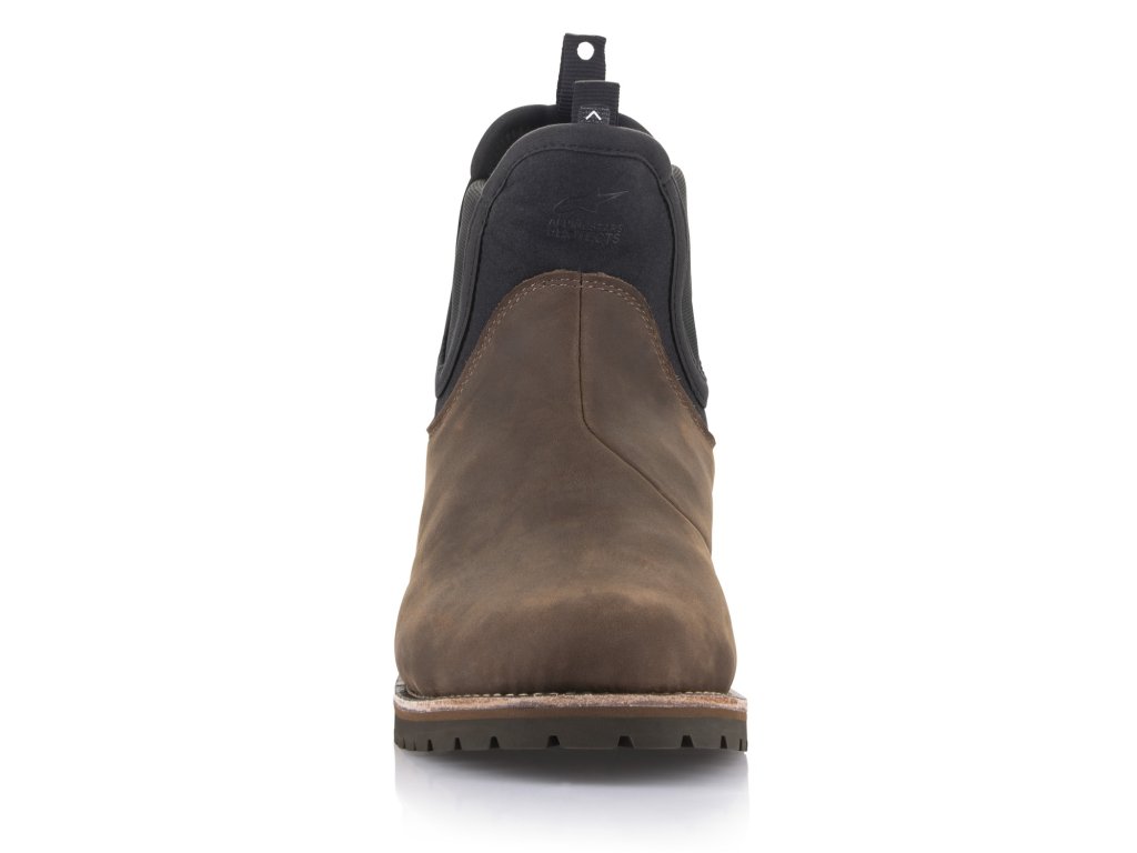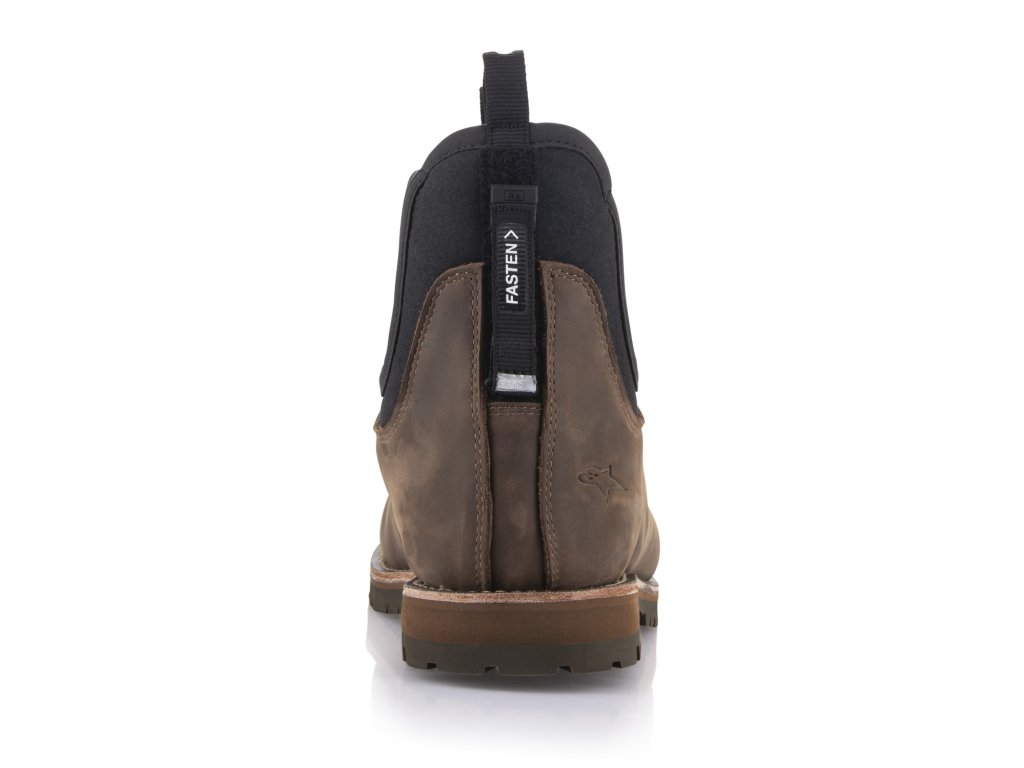 Klasická motorkárska obuv s 1,5 mm hrubou podšívkou z hovädzej kože vychádza z obľúbeného štýlu kožených členkových topánok Chelsea a vyznačuje sa vysokým komfortom vďaka strečovým panelom v oblasti členku. Aby topánka spĺňala všetky aspekty ochrannej motocyklovej obuvi vzhľadom na jej konštrukciu s vrchnou elastickou manžetou, spoločnosť ALPINESTARS vyvinula inovatívny systém uzamykateľného lanka, ktoré vedie pozdĺž okraja elastickej manžety. Po nasadení topánky ju jednoducho zaistíte zatiahnutím za predné a zadné pútko. Tým sa zabezpečí, že topánka je pružná a zároveň pevne drží na nohe. Vhodné na pohodlné nosenie topánky diskrétne pod nohavicami. Topánky majú certifikát CE.