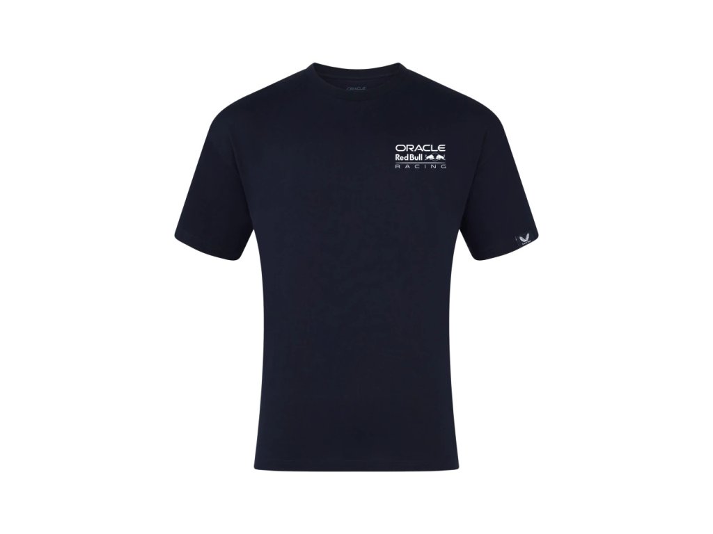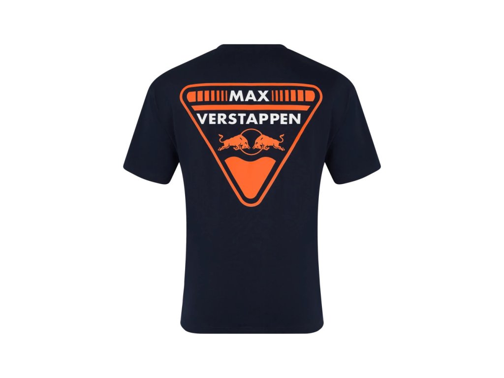 Volnočasové tričko Max Verstappen - Oracle Red Bull Racing v tmavě modrém provedení. Velký potisk Red Bull a MV1 na zádech