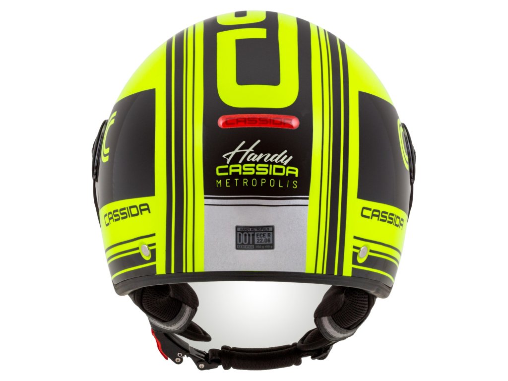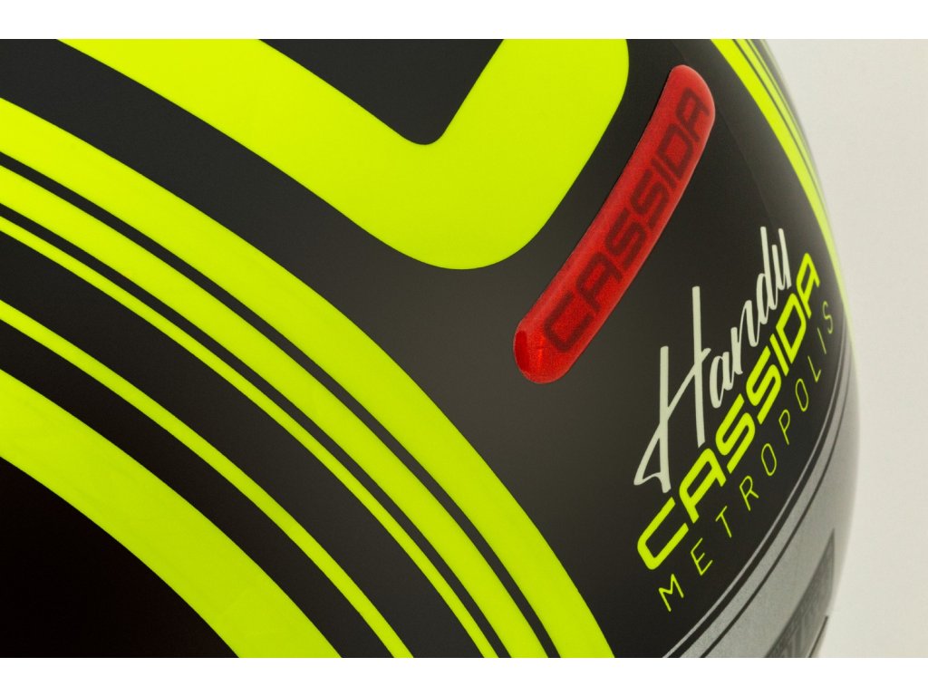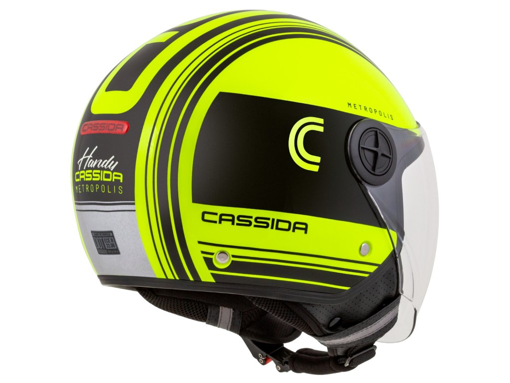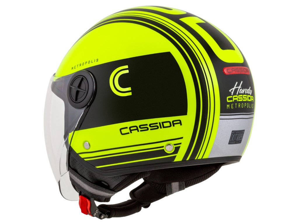 Prilba Handy je všestranná otvorená prilba, ktorá ponúka štyri prilby v jednej vďaka možnosti dlhého a krátkeho plexi, krátkeho priezoru a zátky plexi mechanizmu. Nízky profil škrupiny DEMI JET poskytuje pohodlné uloženie v kufri skútrov. EPS polystyrén v tvárovej časti s prípravou na komunikátorové slúchadlá. Prilba je certifikovaná podľa normy ECE 22.06. HI VIS verzia Handy Metropolis Safety s reflexnými grafickými prvkami, fluo povrchmi a reflexnou nálepkou CASSIDA umiestnenou v zadnej časti prilby.